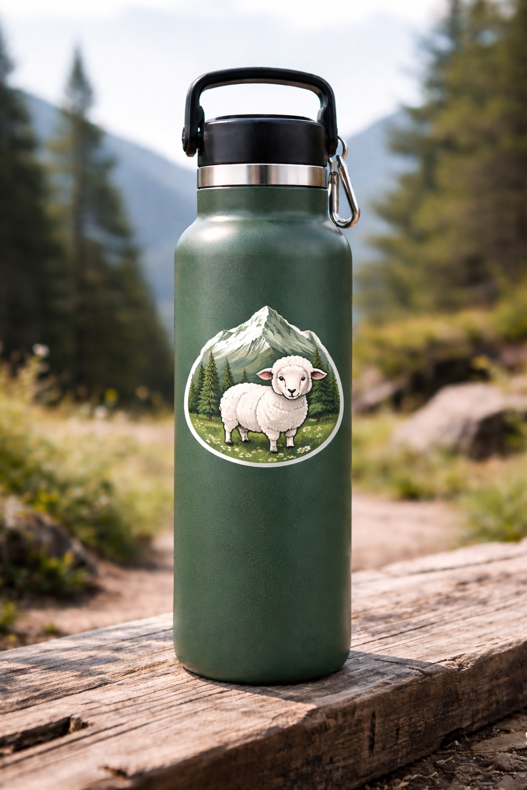 Edelstahl-Thermosflasche mit Berg- und Schaf-Motiv.
